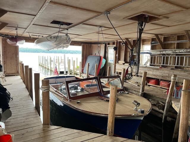 Beautifully maintained WOODLAND PARK 5 bedroom home with a substantial BOATHOUSE. New furnace in 2026, new well pump in fall 2025,and a recently updated kitchen. The extensive tiered decking allows for great group entertaining while enjoying the fantastic water views of Sheppard Bay. Unique to this property is a boat hoist for a 26' wood boat inside the boathouse, a sandy beach area for the kids to play, an extra outbuilding housing beverage coolers and refrigerators, a newer 26' x 26'garage with attic, lovely terraced garden to waterfront with a unique stone architecturally designed wall, plus a WHOLE HOUSE DEHUMIDIFER and CENTRAL AIR! Tucked away on a heavily wooded lot with a winding driveway off a private road adds to the ambiance of the home. Summer living at it's best!